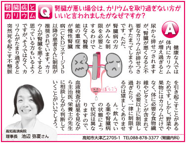 高知新聞朝刊 健康の連絡便に「腎臓病とカリウム」が掲載されました。