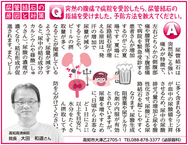 高知新聞朝刊 健康の連絡便に「尿管結石の原因と対策」が掲載されました。